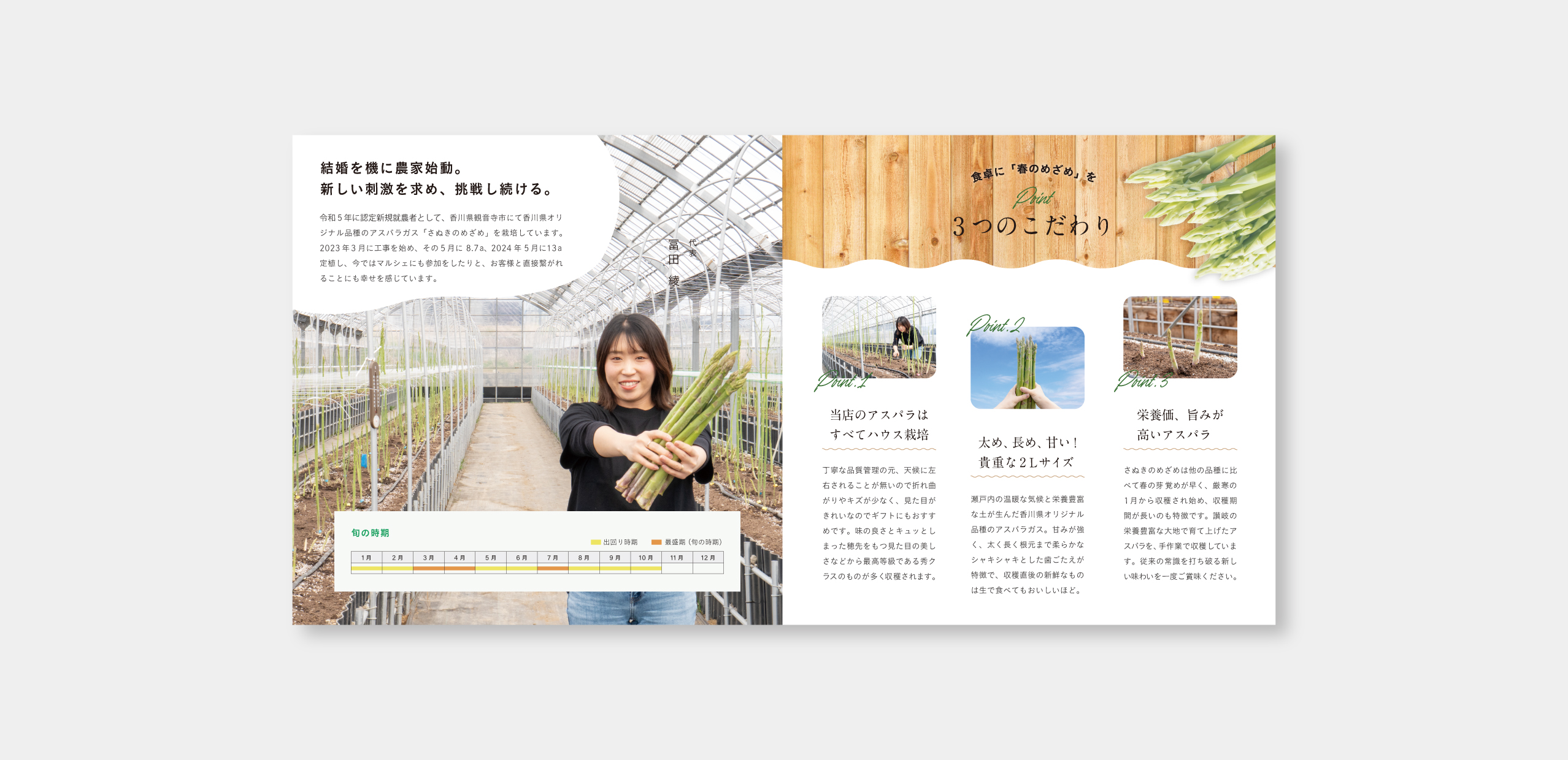 令和5年に認定新規就農者として香川県観音寺市にて香川県オリジナル品種のアスパラガス「さぬきのめざめ」を栽培している、とみだ農園様のパンフレットを制作させていただきました。