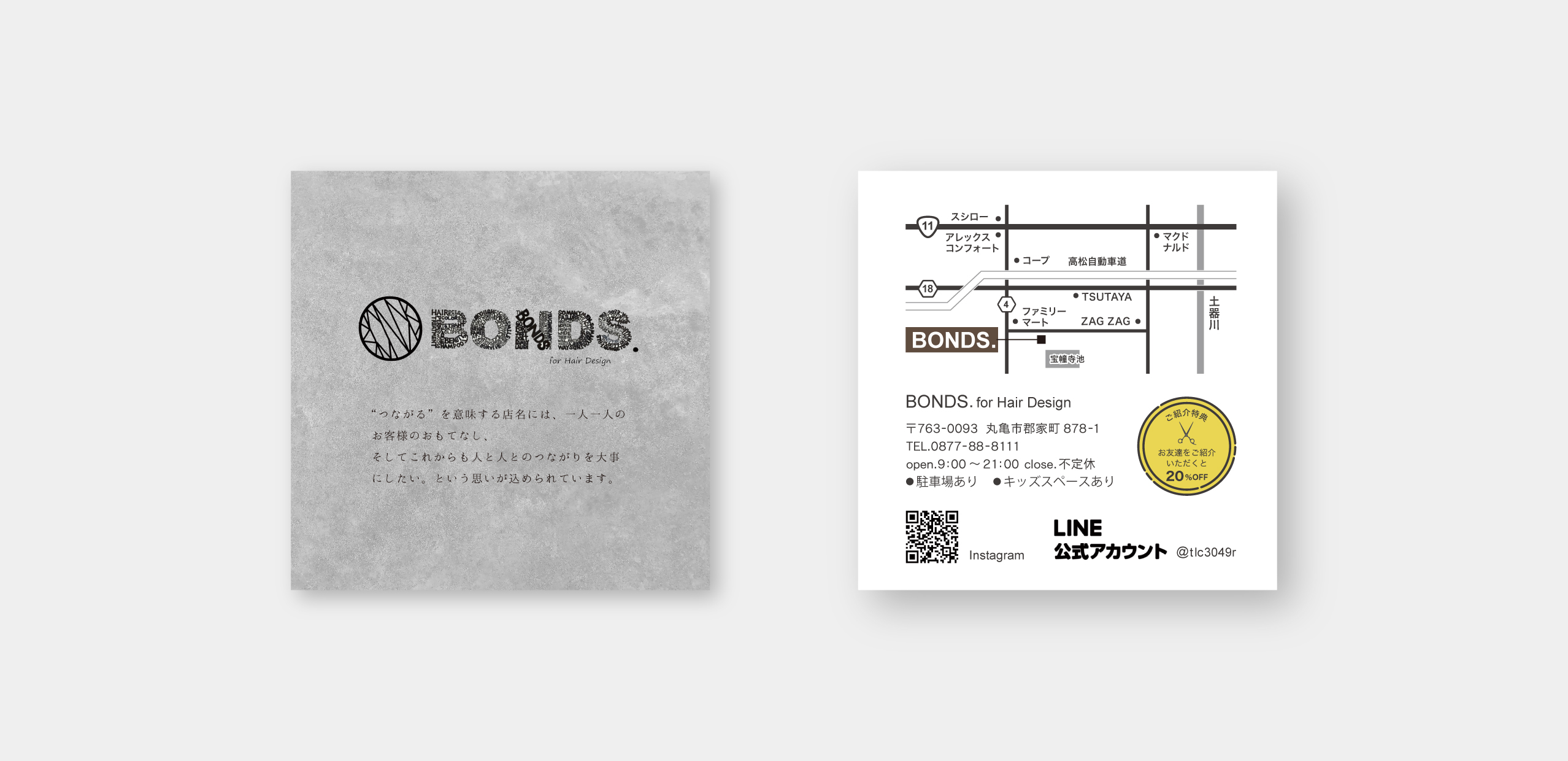 香川県丸亀市にある、「BONDS. for hair design様」のショップカードを作成させていただきました。