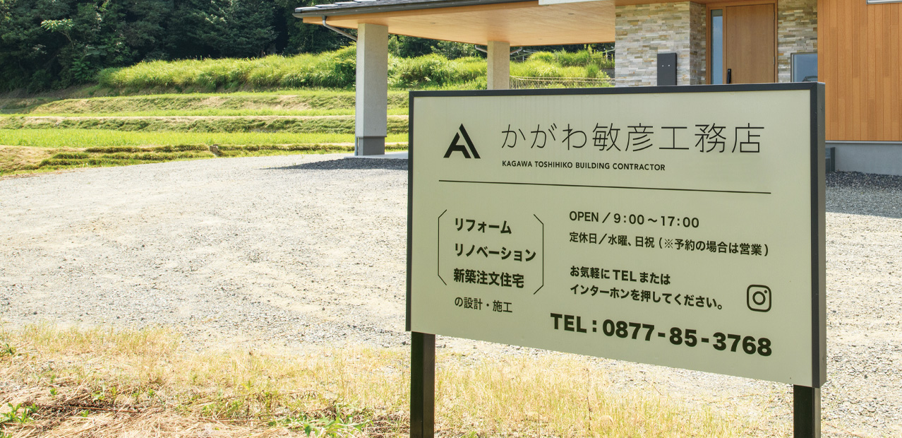 香川県まんのう町にある「かがわ敏彦工務店様」の事務所設立に伴い、敷地内に新しくロードサインを設置させて頂きました。