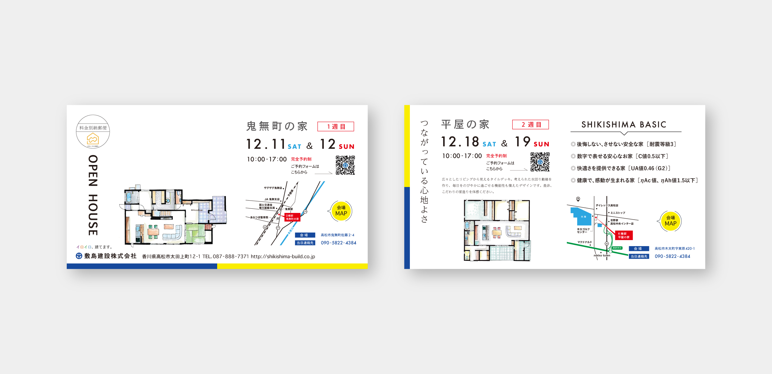 香川県高松市を拠点に、数多くの住宅や公共施設、商業ビルの建設実績を誇る敷島建設様の完成見学会DMチラシを制作させていただきました。