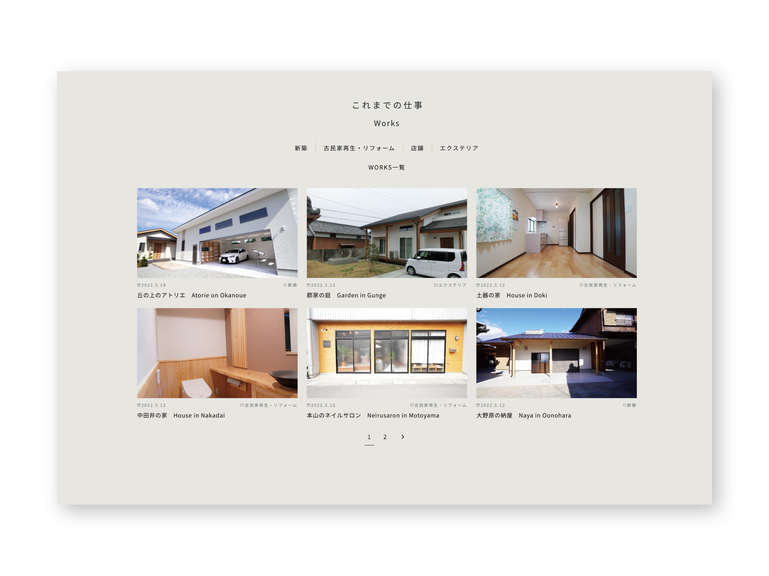 TOPページはシンプルに写真とお知らせ機能のみを配置し、各ページで詳しくかがわ敏彦工務店様の魅力を紹介。自由なレイアウトながらも色もベージュで統一し、全体的にシンプルなあしらいで、高品質さを表現しています。また、機能性に加えて資料請求もできるようにし、身近な地元の工務店のサイトを目指しました。