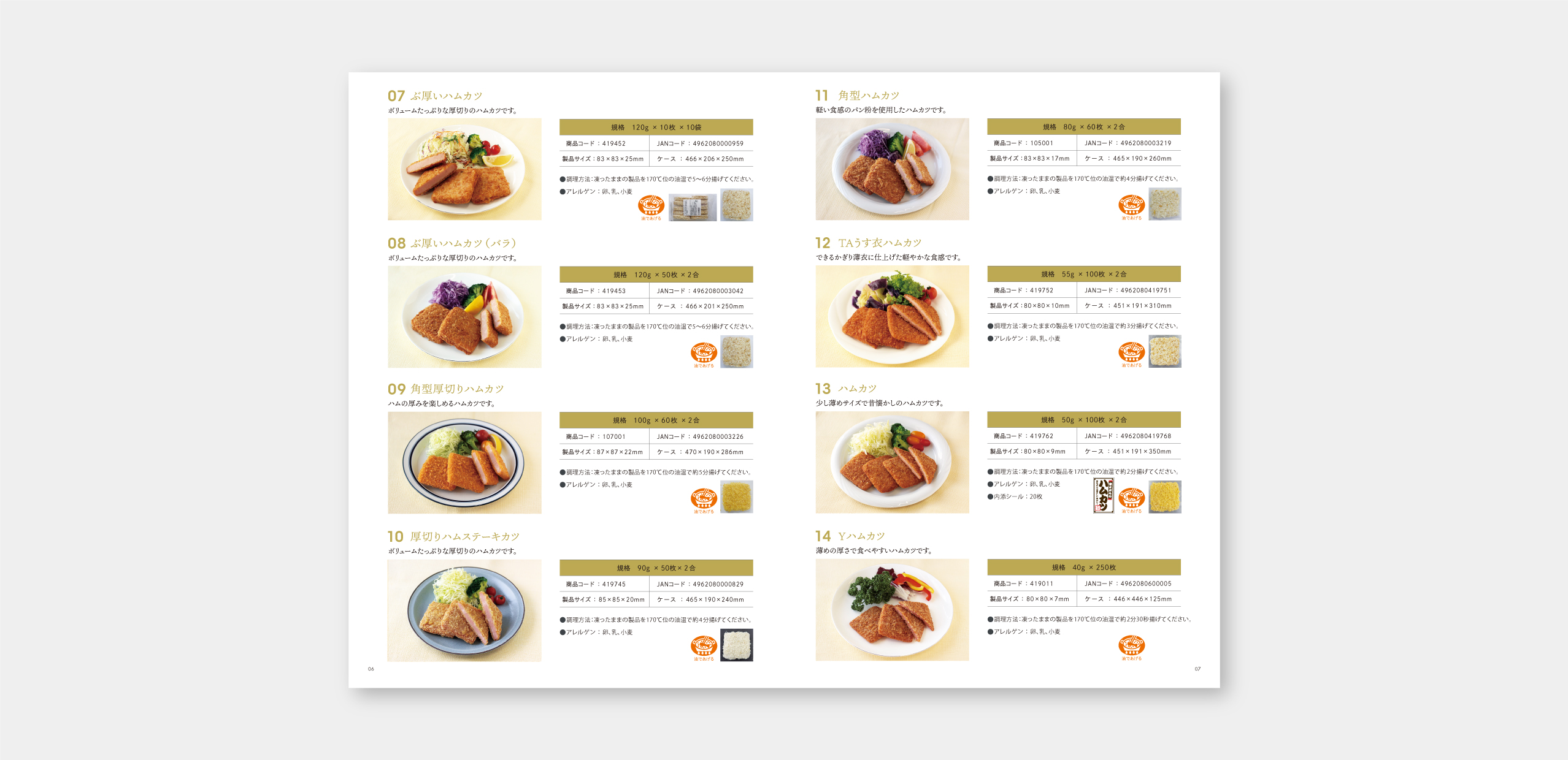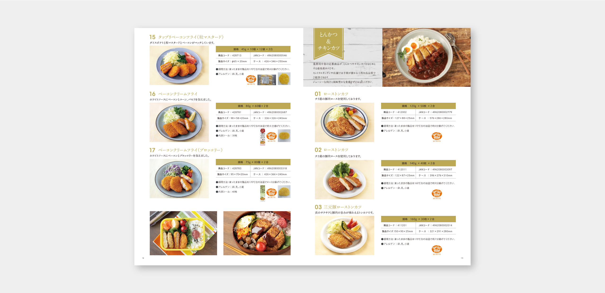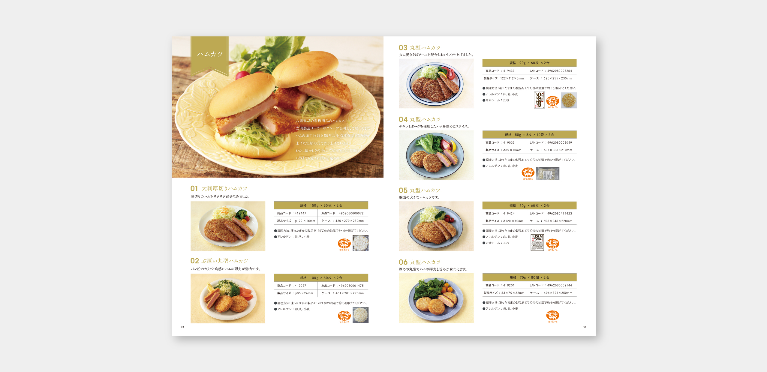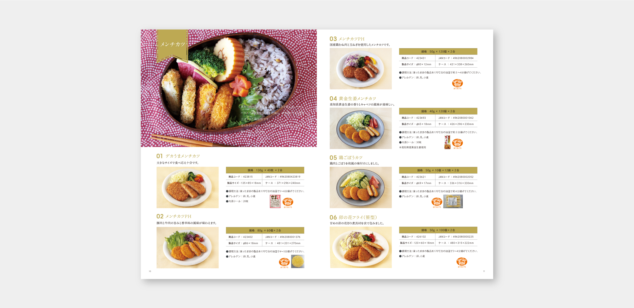 商品がたくさんある中で、人気のハムカツとメンチカツは調理例をメインに素材の美味しさを表現できる工夫づくりにしました。